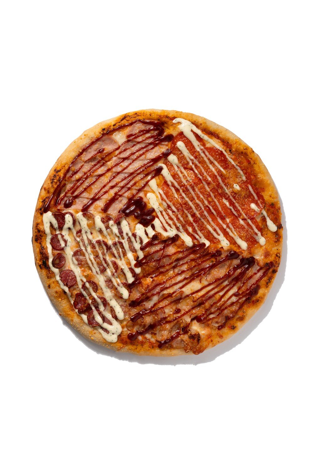 Состав: соус фирменный, моцарелла, ветчина, пепперони, бекон, охотничьи, пармезан, соус пикантный Вес: 590 гр.