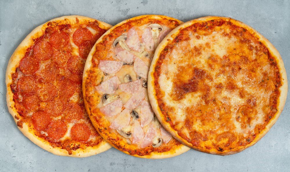 В состав набора входят следующие пиццы: «Ветчина грибы», «Маргарита», «Пепперони» Вес: 1600 гр