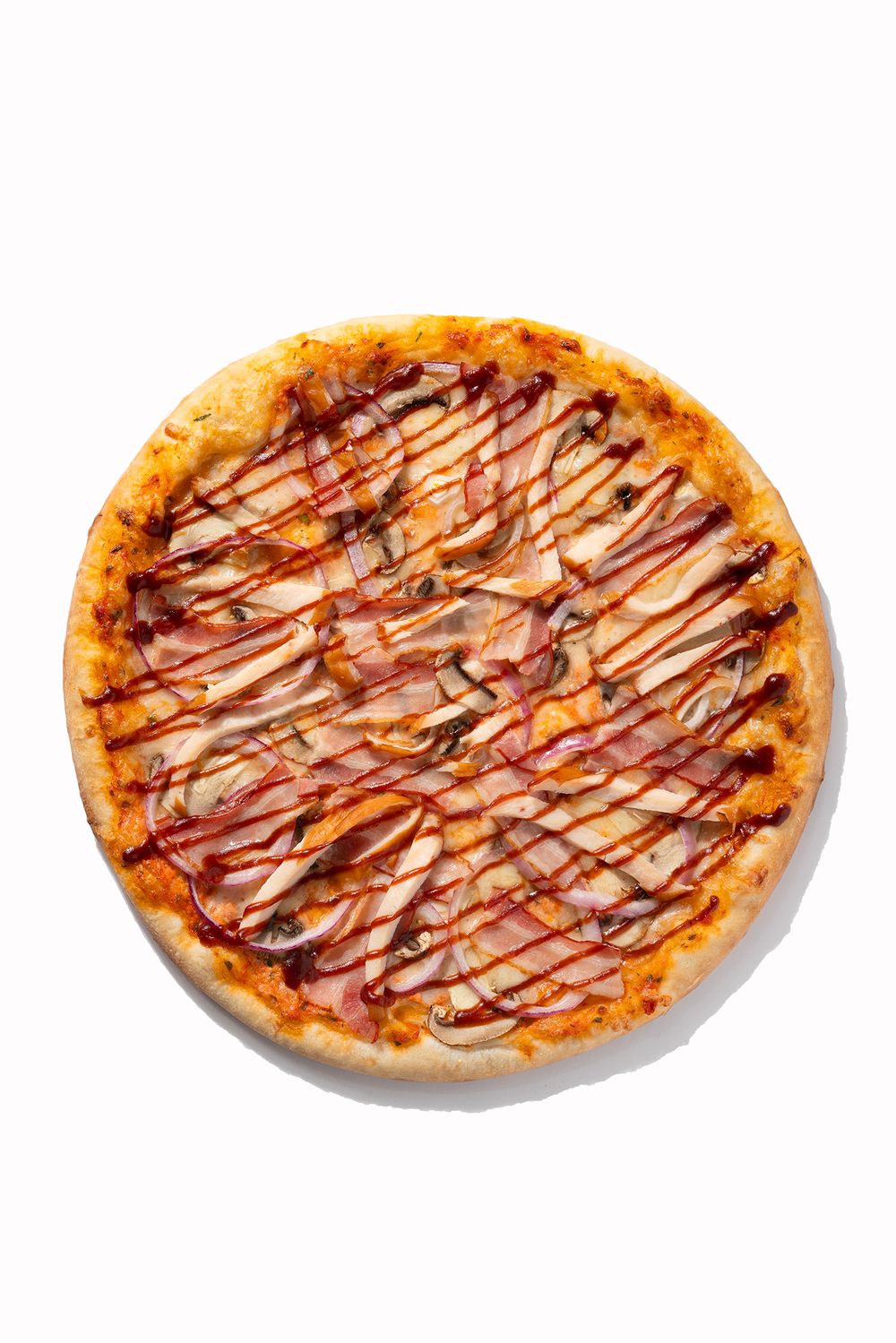 Состав: соус фирменный, моцарелла, шампиньоны, лук, бекон, курица копчёная, соус барбекю Вес: 740 гр.