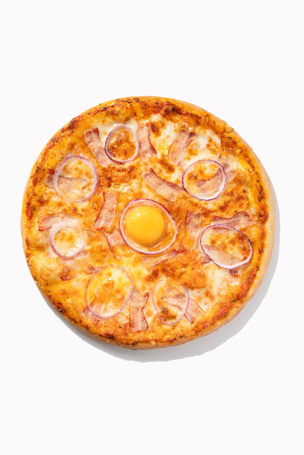 Состав: соус фирменный, моцарелла, бекон, лук, пармезан, желток Вес: 635 гр.