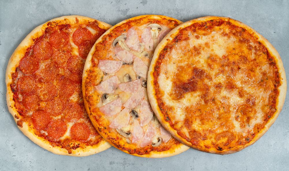В состав набора входят следующие пиццы: «Ветчина грибы», «Маргарита», «Пепперони» Общий вес: 1800 гр.