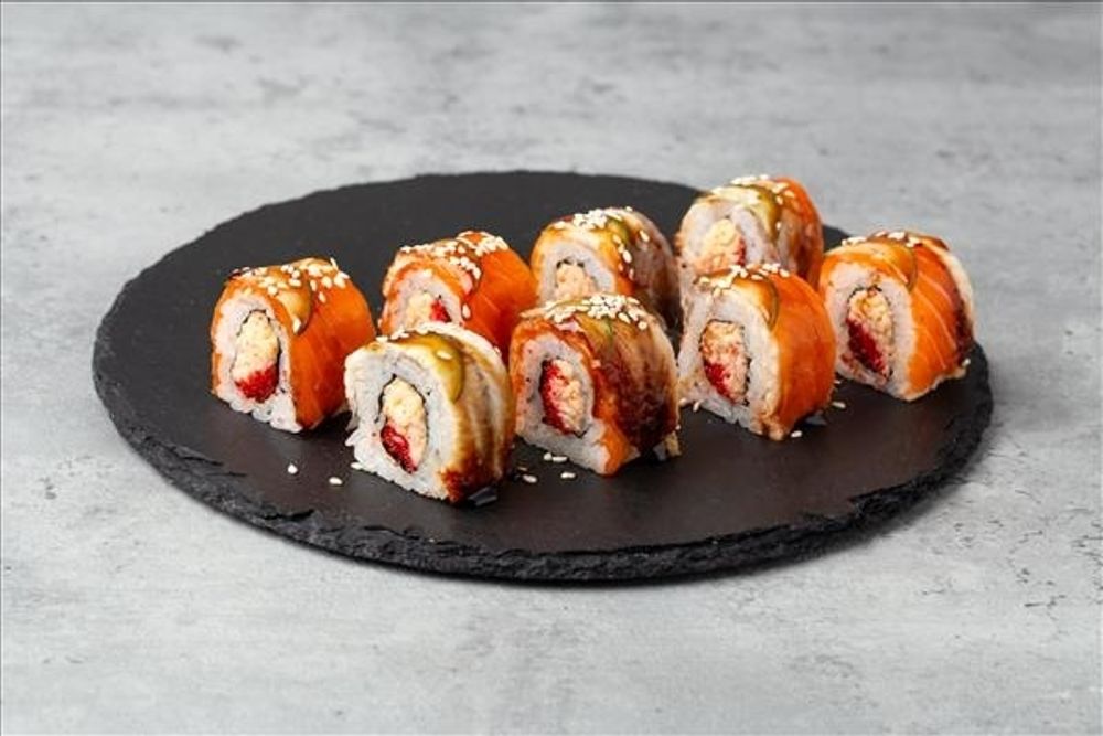 Состав: угорь, «снежный краб», лосось, икра «тобико», огурец, соус унаги, кунжут. Вес: 220 гр.