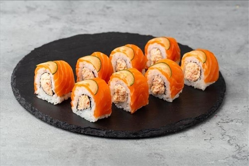 Состав: лосось, «снежный краб», огурец, соус спайси, кунжут Вес: 230 гр.