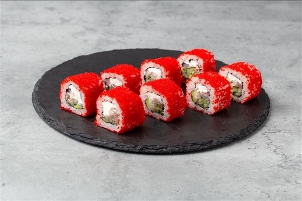 Состав: креветка, сыр, огурец, авокадо, икра «тобико». Вес: 195 гр.