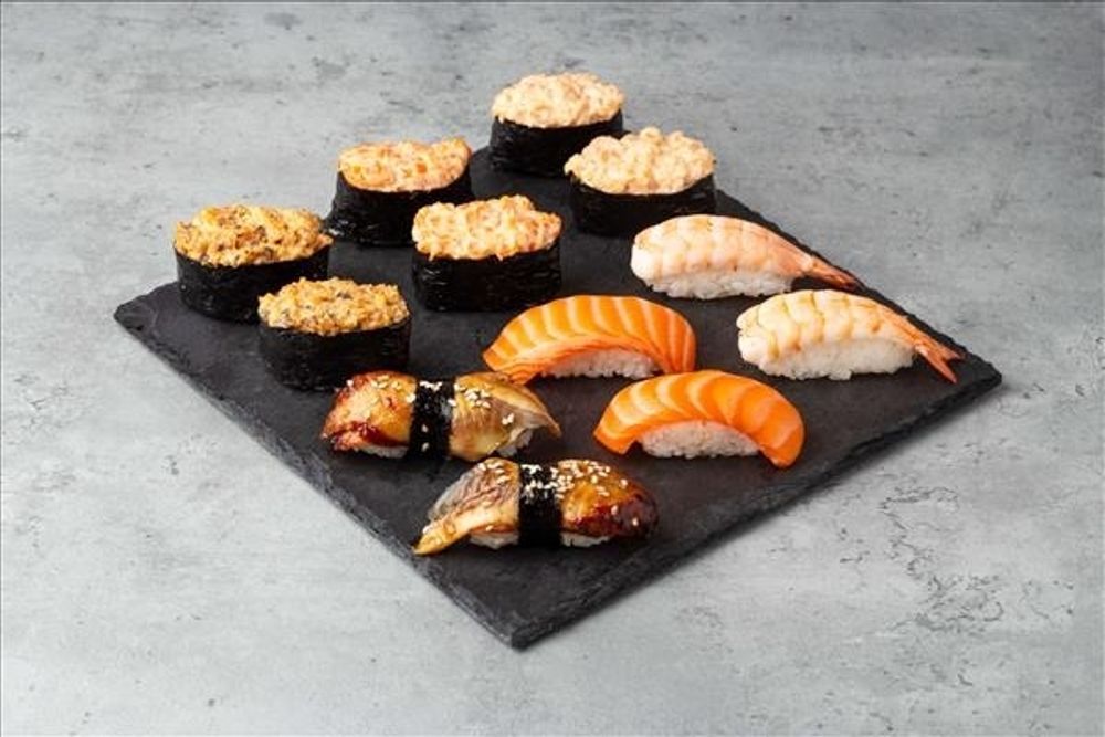 Состав: ■ Суши: — лосось (2 шт.) — угорь (2 шт.) — креветка (2 шт.) ■ Острые суши: — лосось (2 шт.) — угорь (2 шт.) — креветка (2 шт.) Вес: 486 гр.