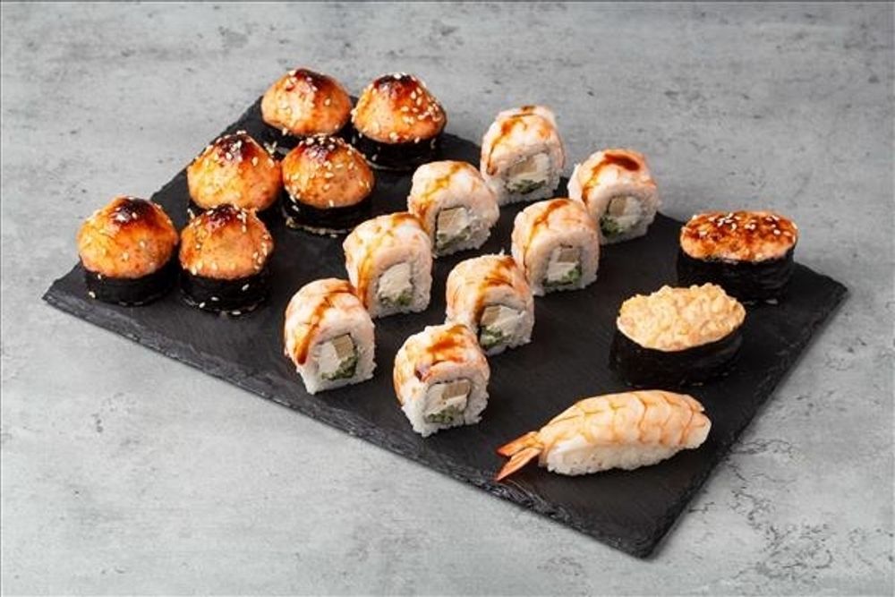 Состав: ■ Ролы: — «Филадельфия креветка» — запечённый с креветками ■ Суши: — креветка — острая креветка — запечённая креветка Вес: 561 гр.