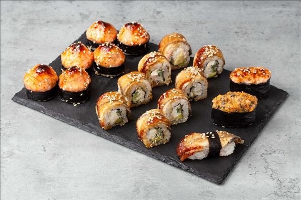Состав: ■ Роллы: — «Филадельфия угорь» — запечённый с угрём ■ Суши: — угорь — острый угорь — запечённый угорь Вес: 566 гр.
