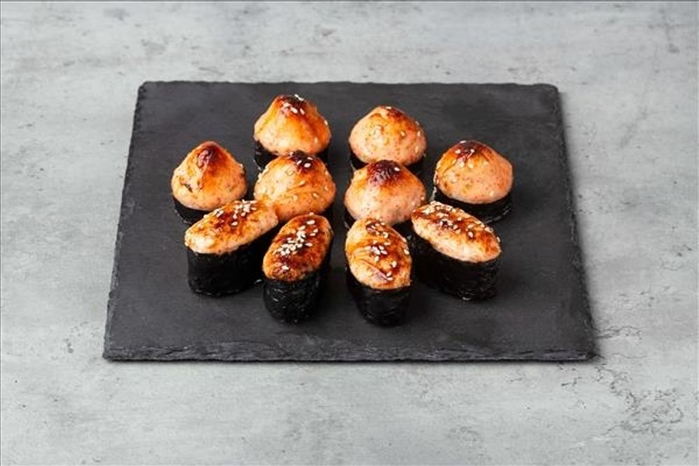 Состав: ■ Запечённый ролл с крабом, ■ Запечённые суши: — лосось, — краб, — тунец, — угорь. Вес: 395 гр.